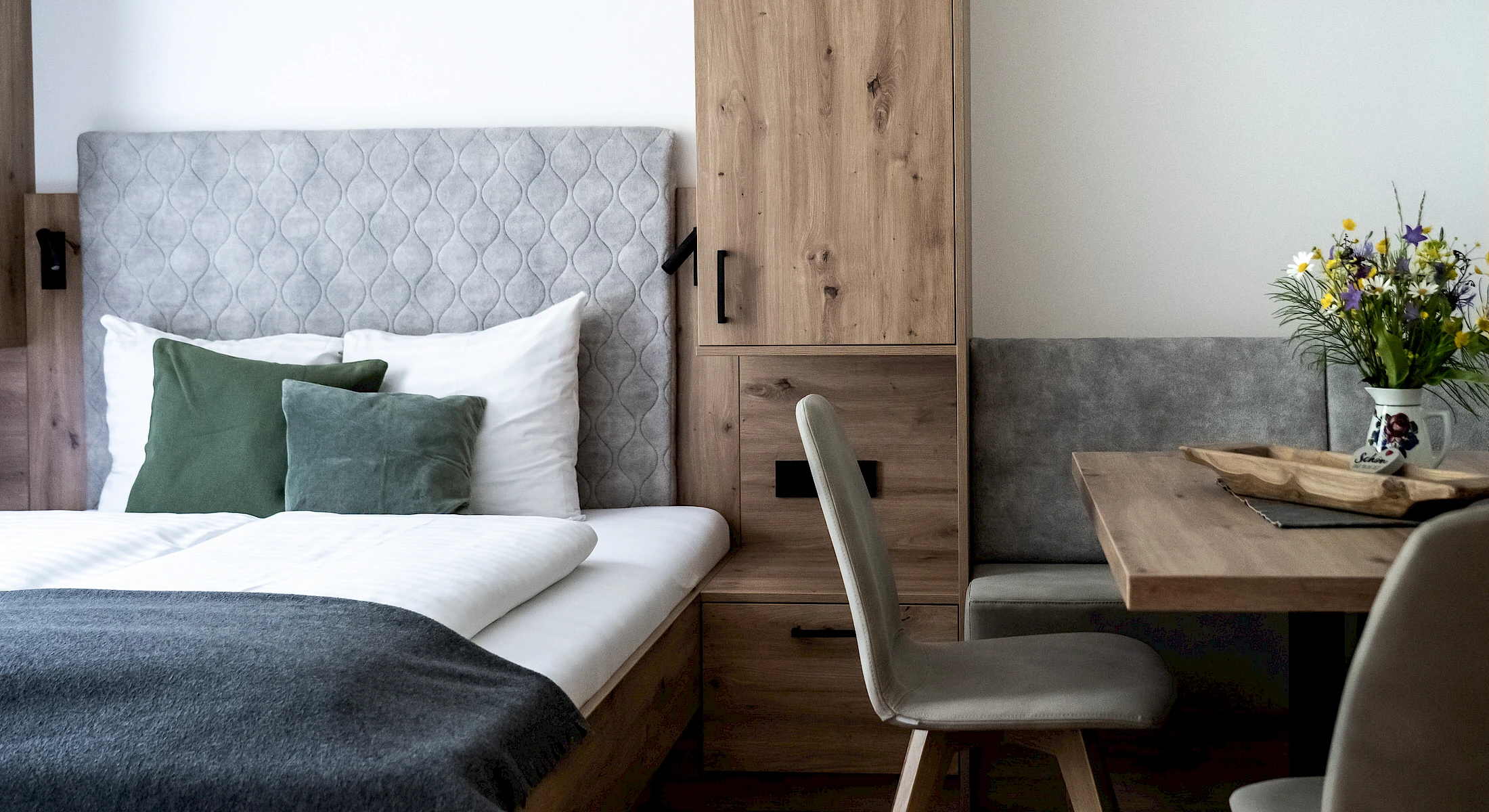 Unsere unterschiedlichen Rückzugsorte gestalten wir so, dass alle finden, was sie suchen. Und man gar nicht anders kann, als sich dort rundum wohlzufühlen. Mit komfortablen Betten für tiefen Schlaf, warmem Holz für viel Gemütlichkeit, weiten Blicken nach draußen für den Natureffekt.